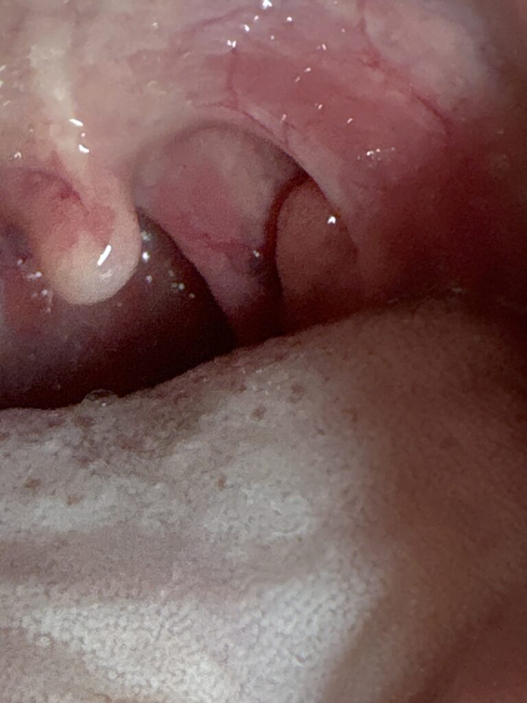 2. 2カ月前に風邪をひき、扁桃腺が腫れて咳が続いてから1ヶ月半前に扁桃の奥の扁桃とこすれる壁のような部分に3ミリの血豆みたいな物が2つ上下に並んでできました。